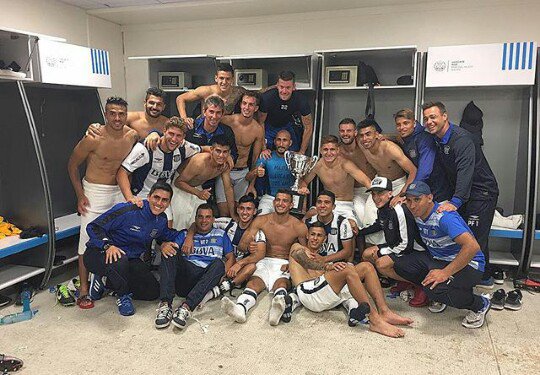 | El plantel "albiazul" posó con el trofeo en el vestuario |